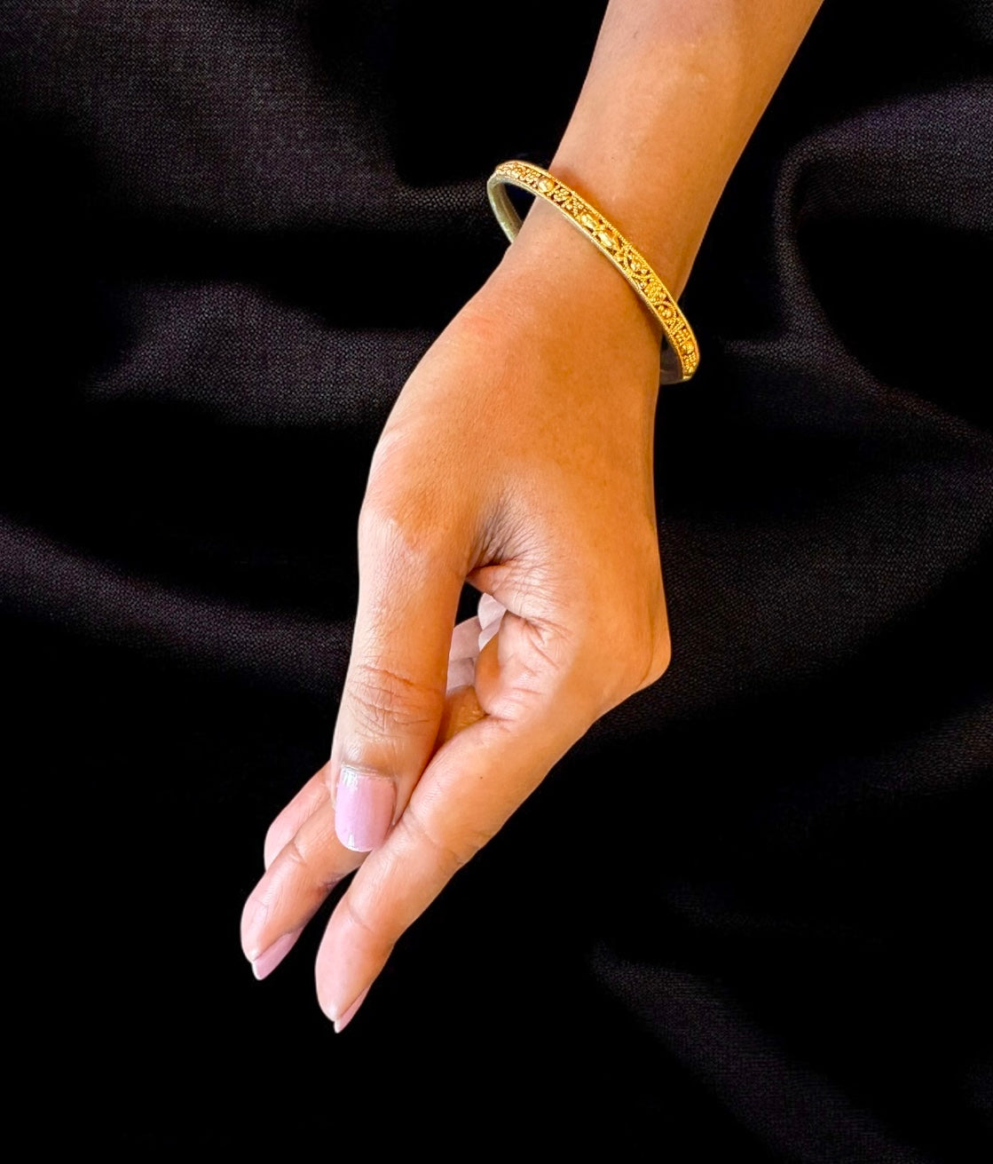 Let your hands soak all the attention when you wear this gorgeous bangle with ornate filigree design. Handcrafted in Sterling Silver (92.5%) this is a traditional design that is made more attractive bangle . This seamlessly handcrafted bangle can be bought as a single piece or in a pair. The price listed is for a single bangle.