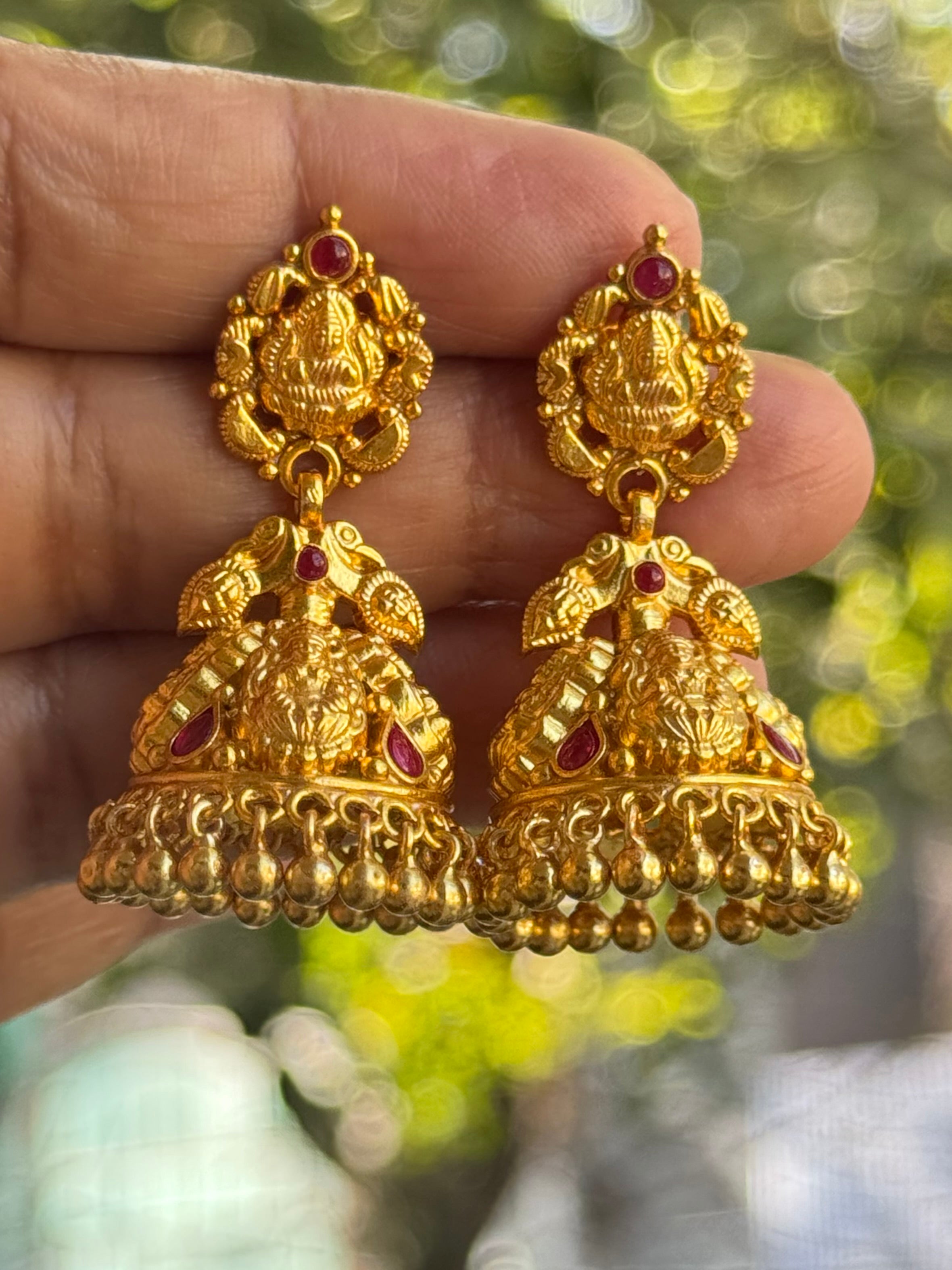 Each pair is fully handcrafted in our workshop from 92.5 Sterling Silver, using intricate techniques inspired by ancient temple jewelry. Gold-dipped in 24K through a specialized process, these jhumkis offer a luxurious real gold look, with an antique finish that adds vintage charm.