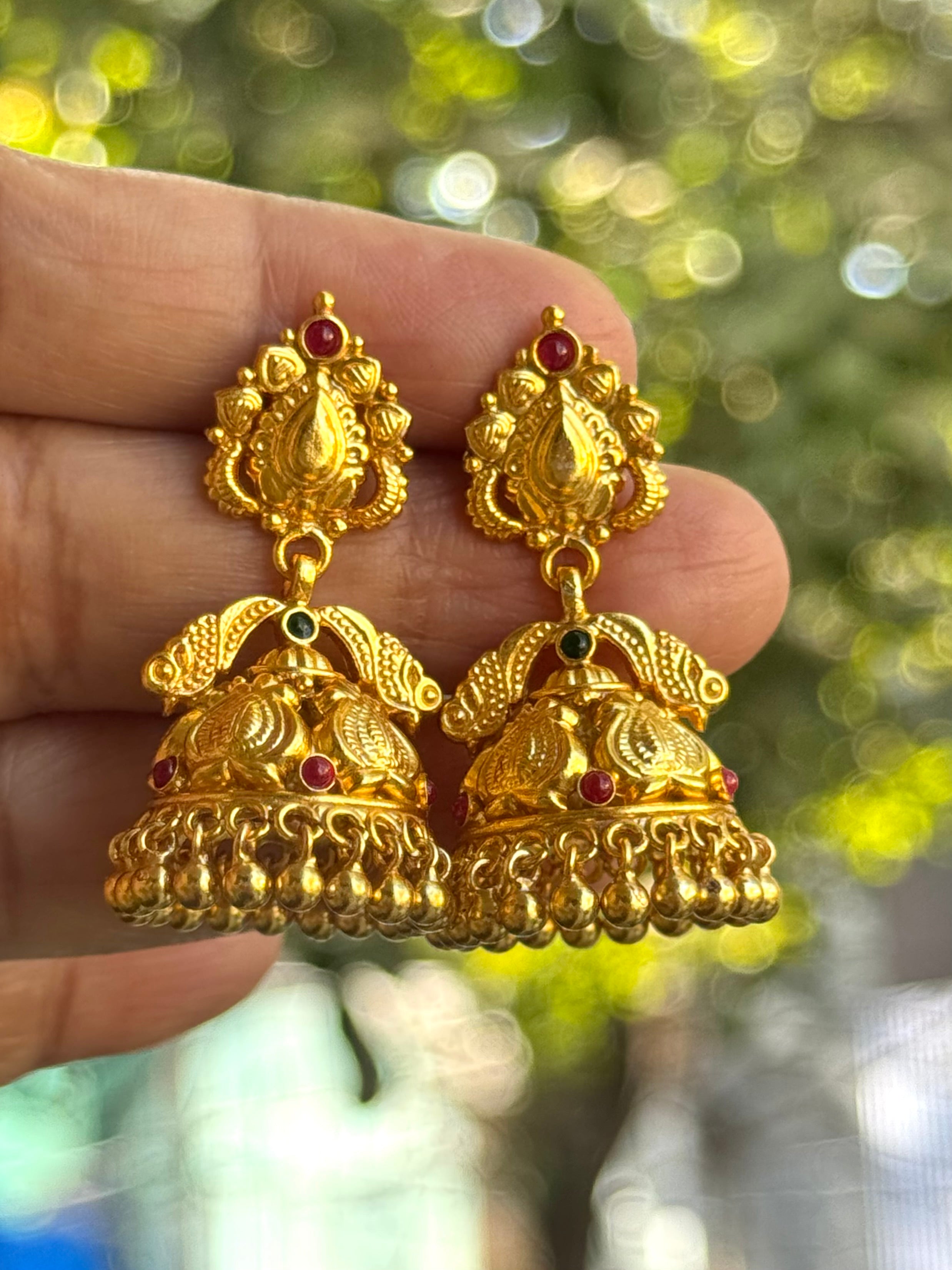 The classic dome-shaped jhumki is adorned with shimmering red and green stones, capturing the richness and vibrance of traditional Indian aesthetics. Known for their cultural significance and festive appeal, Kemp Jhumkis have long been a staple in bridal and classical dance adornments.