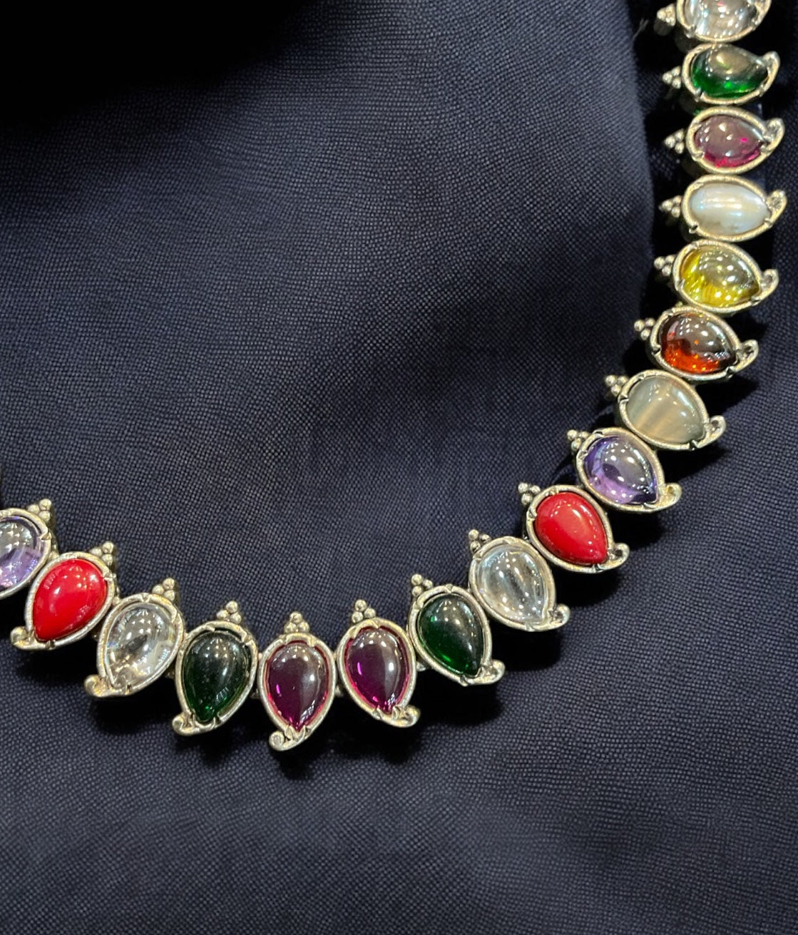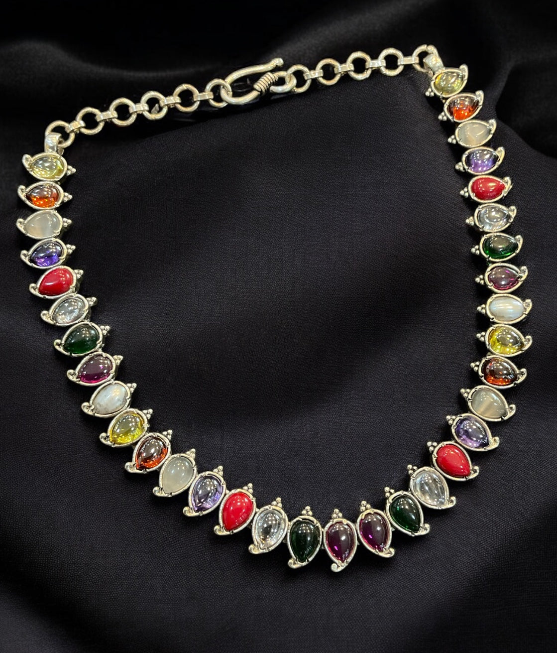 Catch everyone's attention with this beautiful Sterling Silver (92.5%) navratna or nine-gems necklace which will match any oufit. Crafted using techniques used in ancient South Indian antique gold temple jewellery the entire piece is crafted in pure silver.