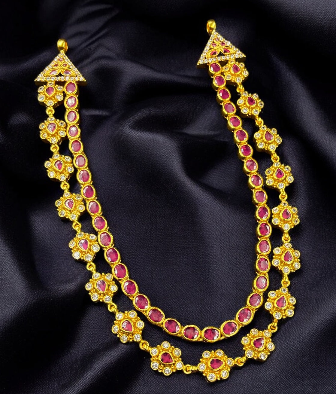 Drape yourself in elegance with this ornate 925 Silver necklace, masterfully crafted to capture the essence of timeless tradition and contemporary sparkle. Featuring a harmonious blend of premium quality red Kemp stones and AAA+ Grade Cubic Zirconia, each stone is expertly set in a closed-setting for a seamless, high-end finish.