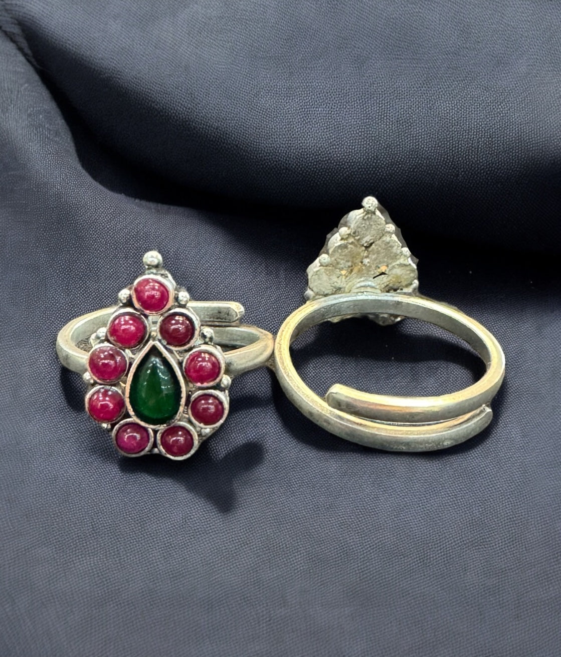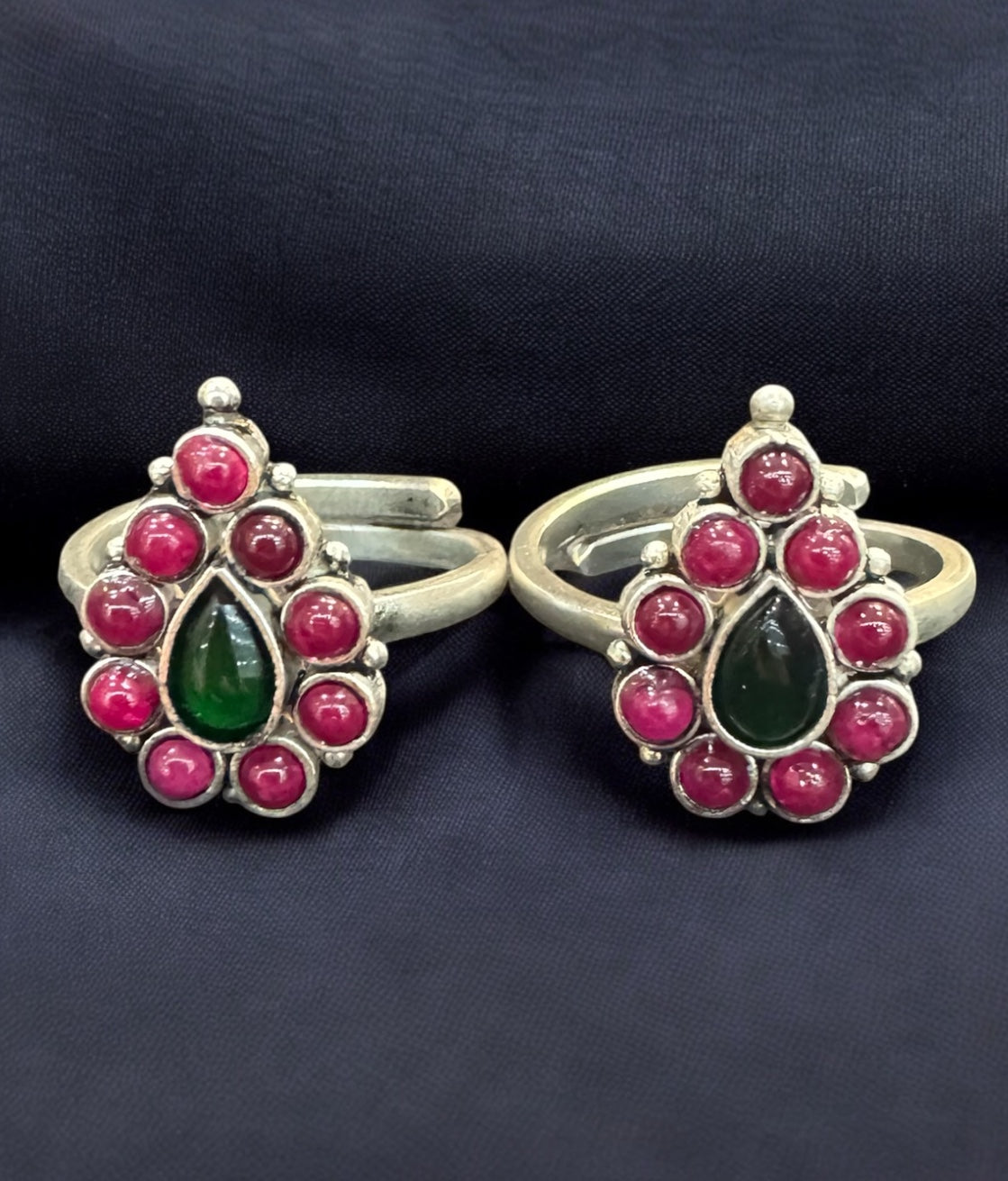A gorgeous pair of handcrafted sterling silver (92.5%) toe-rings fit for bridal wear. The pair is decorated with kempu stones and this gives it a gorgeous look.The silver band at the back is an open one and can be adjusted according to your toe-size.