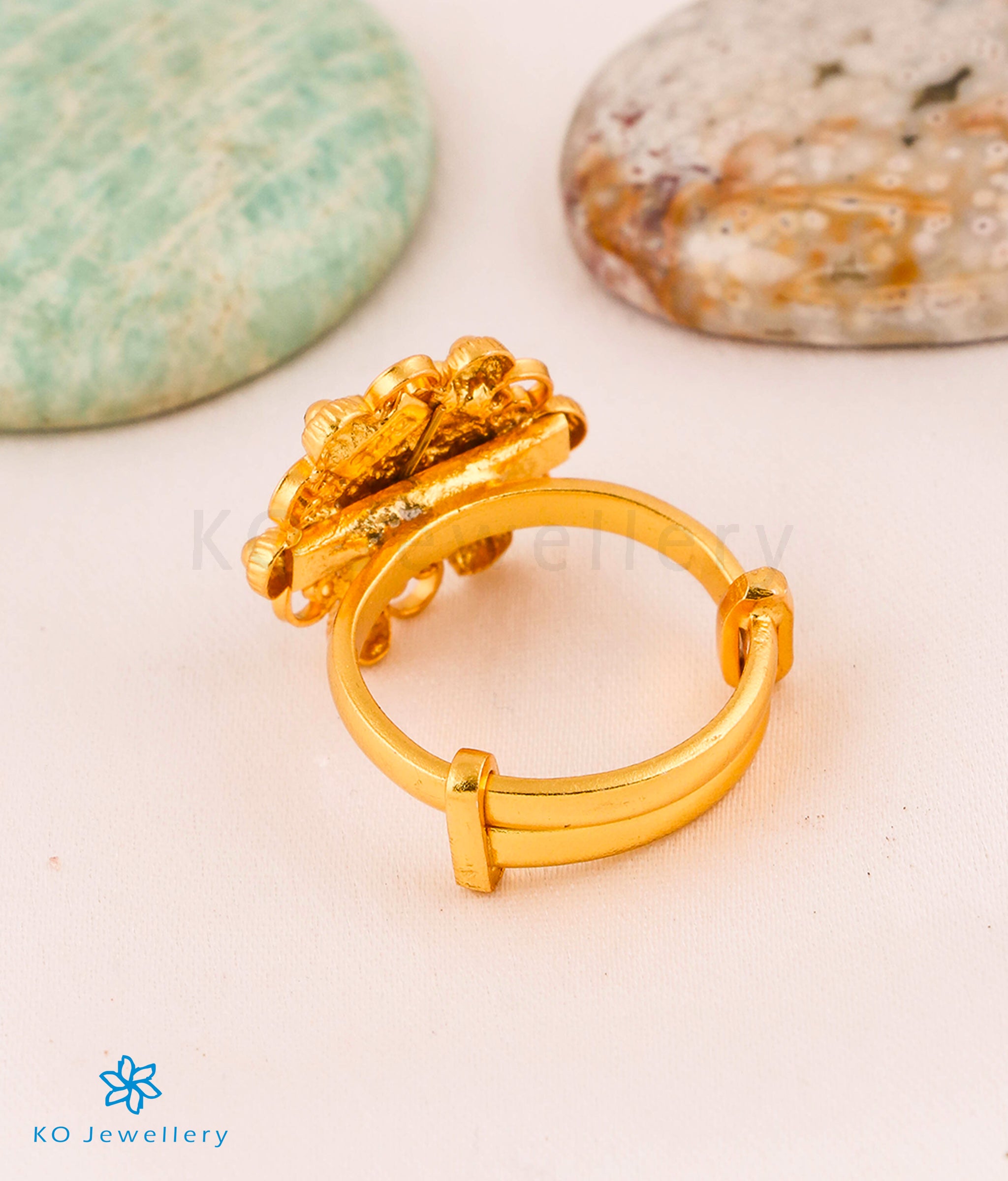 This ornate kempu stone finger ring is truly a head-turner.Crafted using techniques used in ancient South Indian antique gold temple jewellery the entire piece is crafted in pure Sterling Silver (92.5%) and gold dipped . This ring is adjustable according to the size of your finger.