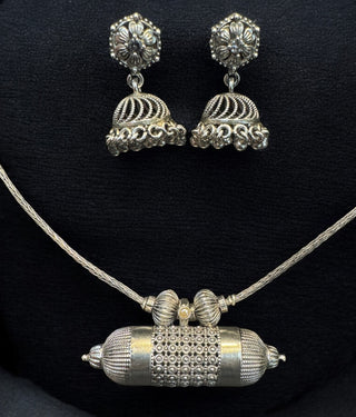 The Vajra Shankhu, Chakra Nama Silver Pearl Necklace & Earrings (Oxidised)