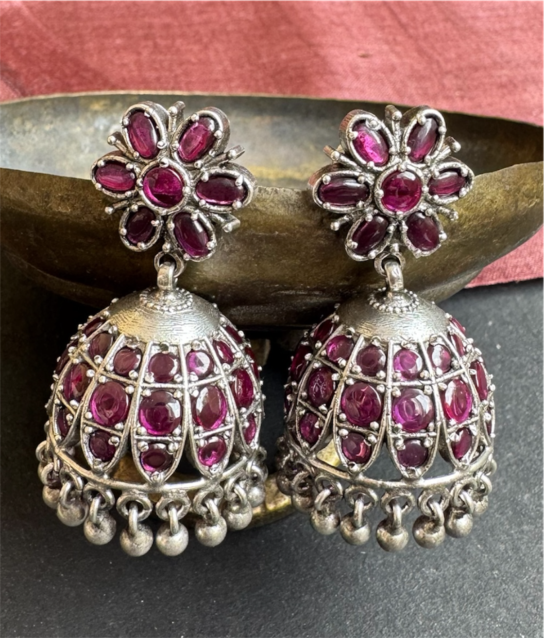 This exquisite 92.5 silver jhumka showcases a beautiful and unique traditional design that radiates elegance and charm. Adorned with vibrant kemp stones the piece reflects the grandeur of classic South Indian craftsmanship.