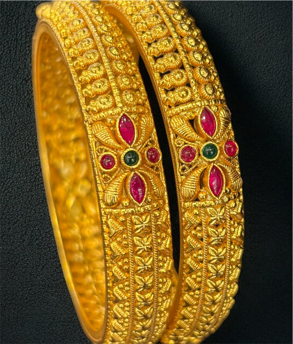 Each piece is meticulously made from 92.5 Sterling Silver, then gold-dipped using a special process to achieve a rich, antique finish that mirrors the look of real gold. The intricate patterns reflect the beauty of traditional craftsmanship, making these bangles a meaningful symbol of grace and tradition.