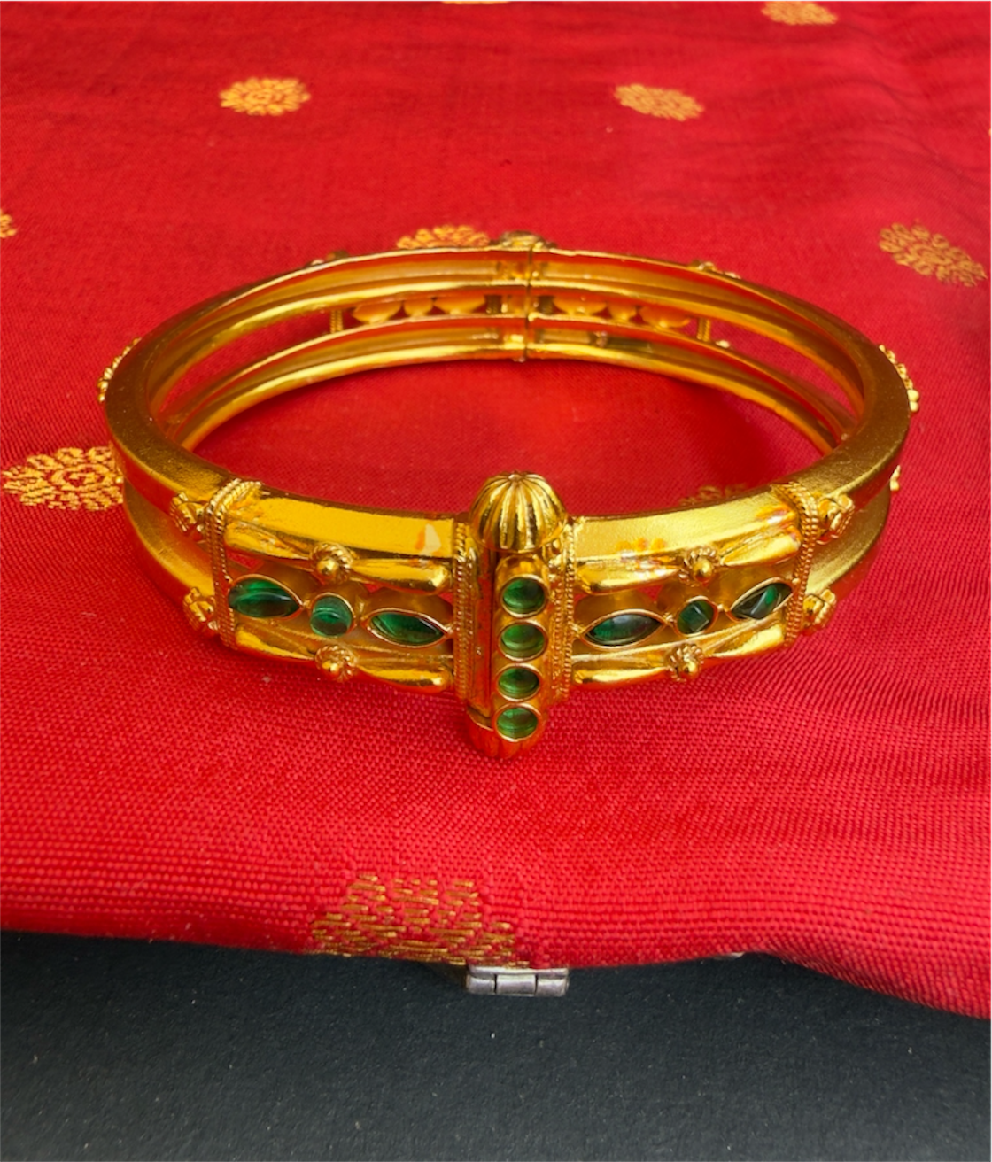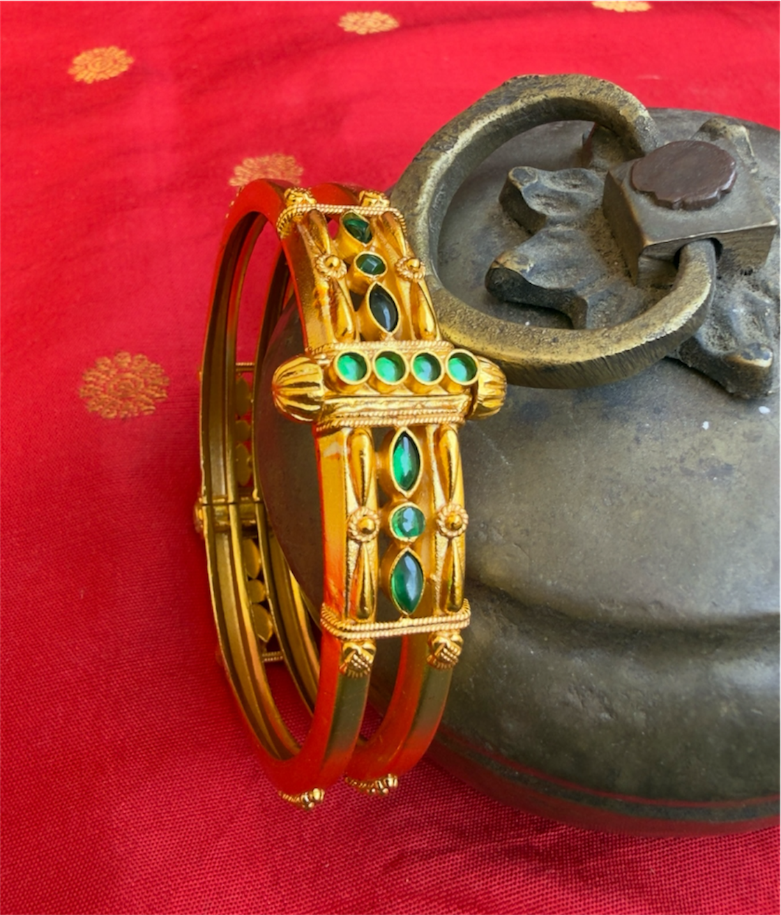 Intricate detailing and tiny kempu stones make this bracelet an irresistable accessory.This design is a staple of Kodava traditional jewellery. Handcrafted with care in Sterling Silver (92.5%) using techniques used in ancient South Indian antique jewellery the bracelet is gold-dipped in a special process to give an antique look.This is a kada with a screw that can be opened.