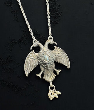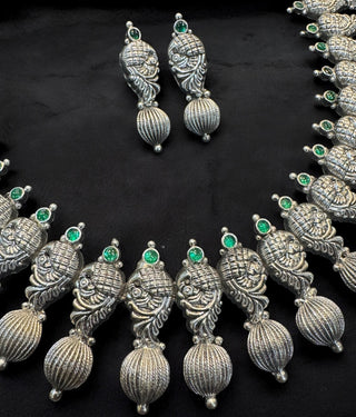 The Suvrata Silver Gandaberunda Beads Necklace & Earrings (Oxidised)