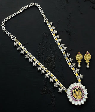 The Suvrata Silver Gandaberunda Thread Necklace & Earrings (Oxidised)