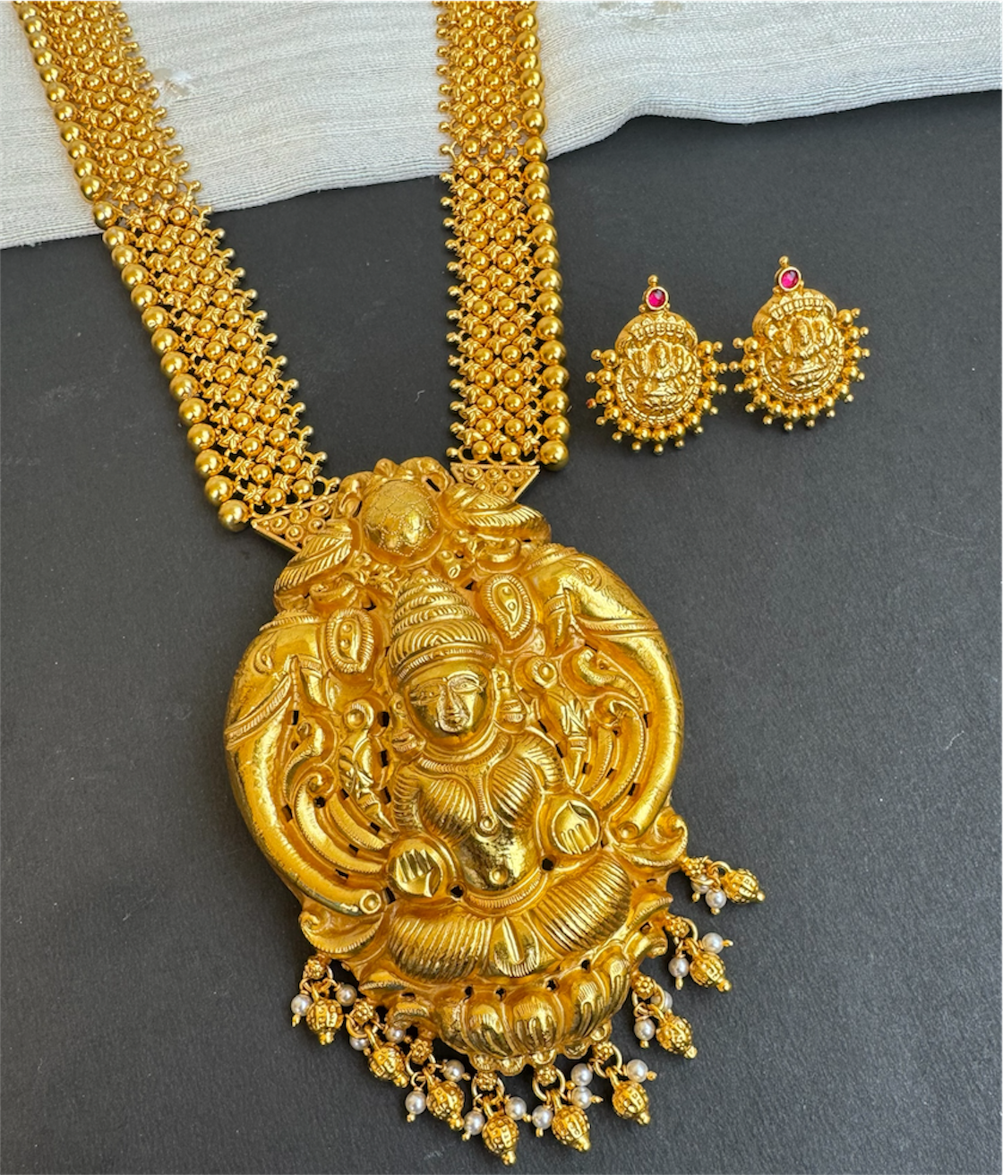 Handcrafted using techniques used in ancient South Indian antique jewellery and studded with tiny kempu stones it is gold-dipped in a special process to give an antique look.