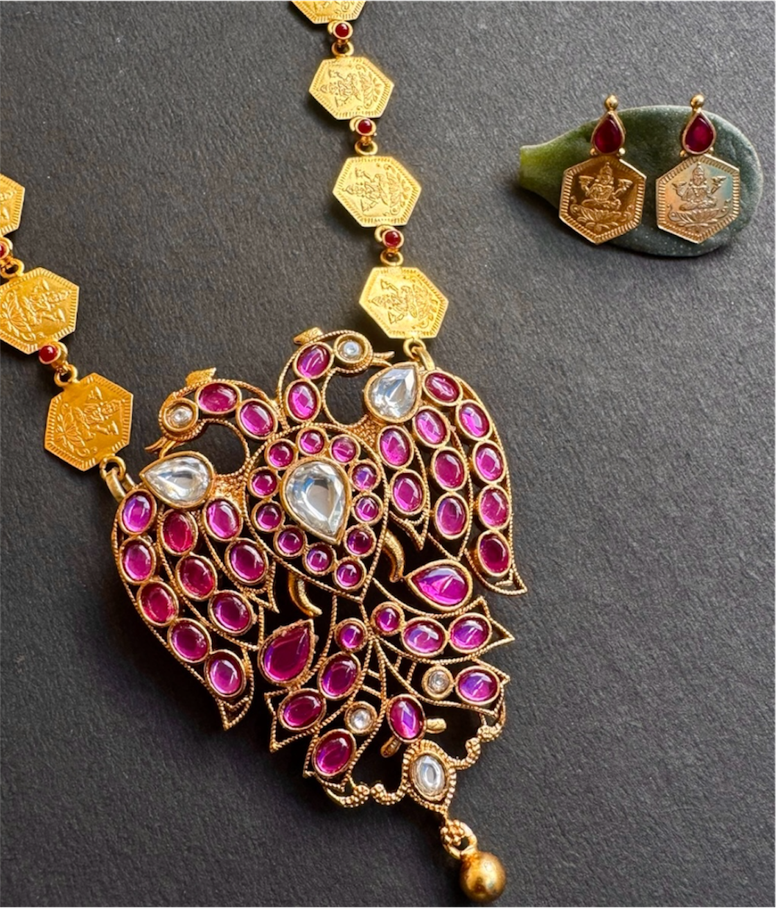 The intricate detailing, traditional motifs and flawless craftsmanship make it a standout temple jewellery piece—grand enough for special occasions yet versatile for contemporary styling.
