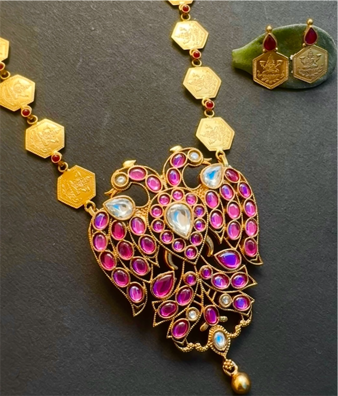 Crafted in pure 92.5 Sterling Silver and dipped in 24K gold using a special chemical-free process- safe on skin, with no lacquer or harmful coatings, this necklace is a fine tribute to traditional South Indian temple artistry. The intricate kasu mala design—composed of antique-style silver coins—adds texture, movement, and historical richness, while the Gandaberunda pendant evokes an aura of regal grandeur.