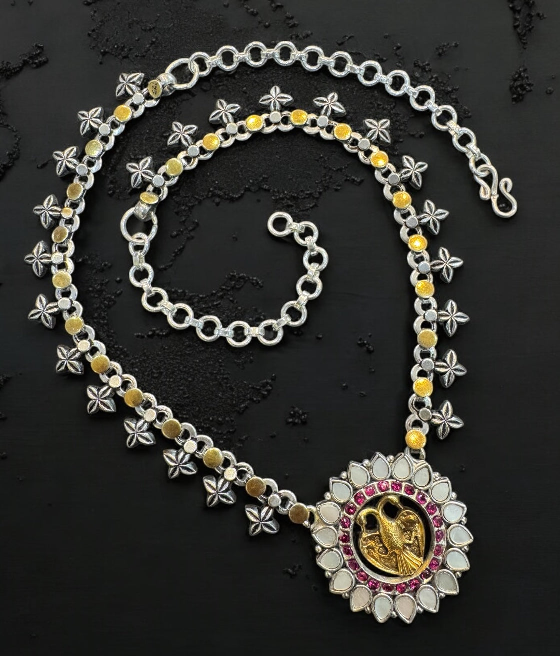 Introducing another KO Original design which revives classic heritage motifs . This Gandaberunda Necklace features a central pendant of the Gandaberunda (surrounded by beautiful mother of pearl and kemp stone)—a two-headed mythical bird from Hindu mythology, renowned for its immense magical strength and its ability to combat forces of destruction. With heads resembling the mighty eagle and a tail like the majestic peacock, the Gandaberunda symbolizes both power and resilience. The necklace is made of pure 925 silver beads in a stunning design and given the 2 tone gold/silver finish .