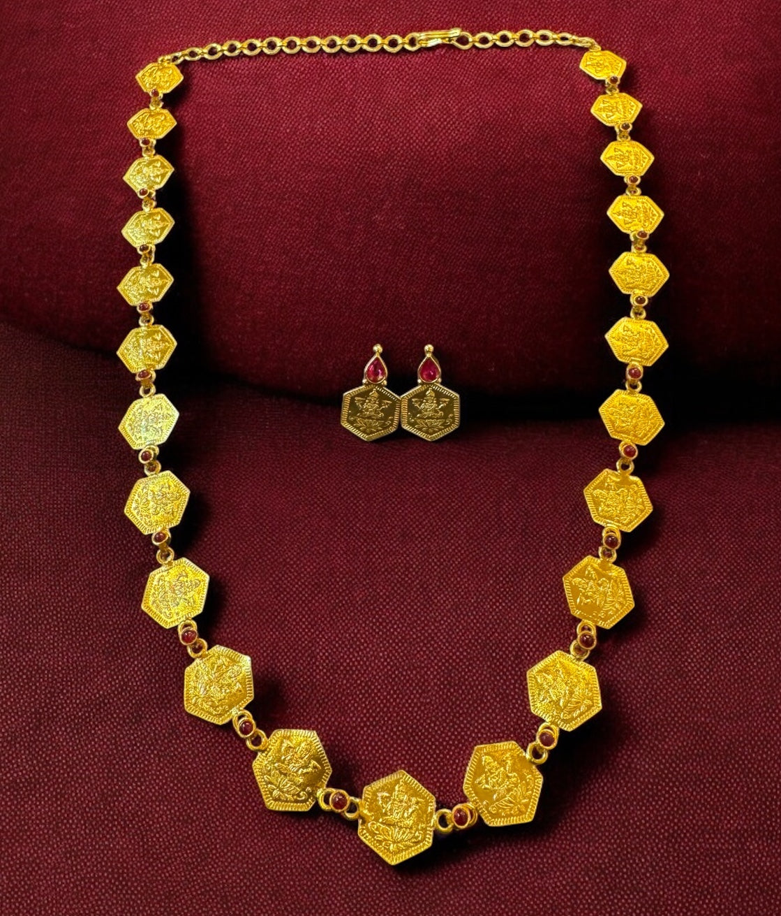 Adorn yourself with timeless elegance in this stunning Kasu Mala Necklace, an ode to divine beauty and cultural heritage. This captivating piece features a detailed engraving of Goddess Lakshmi, symbolizing prosperity and grace decorated with kemp stones .