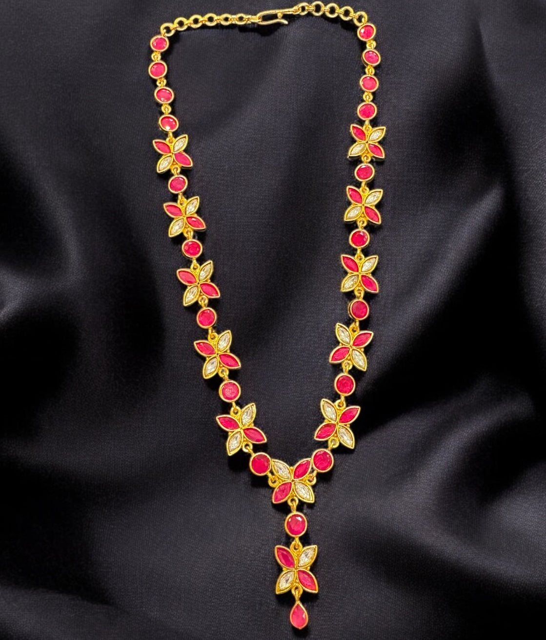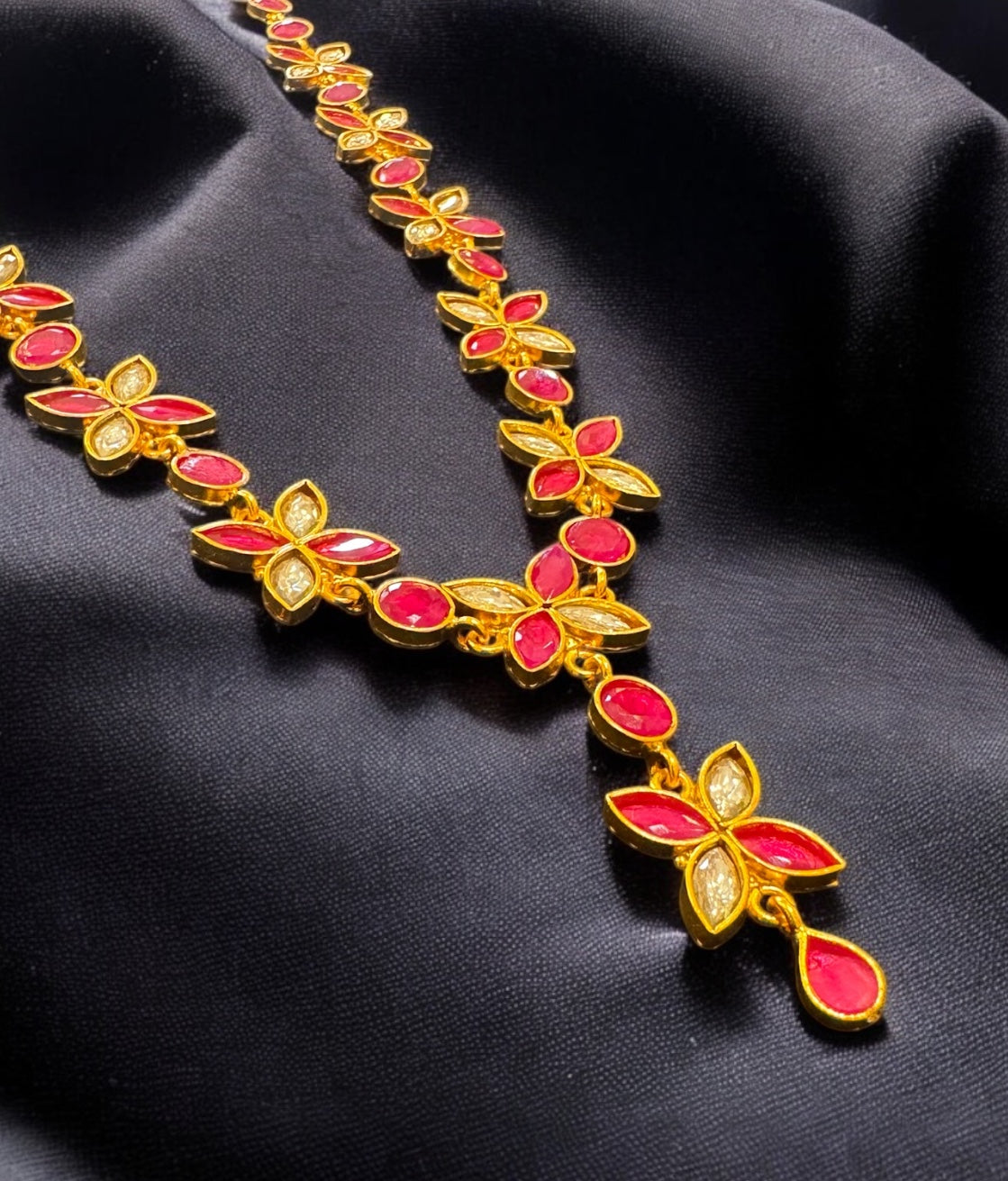 This exquisite Polki stone necklace features a luxurious harmony of deep red and pristine white stones, set in a stunning floral design that radiates regality and grace.