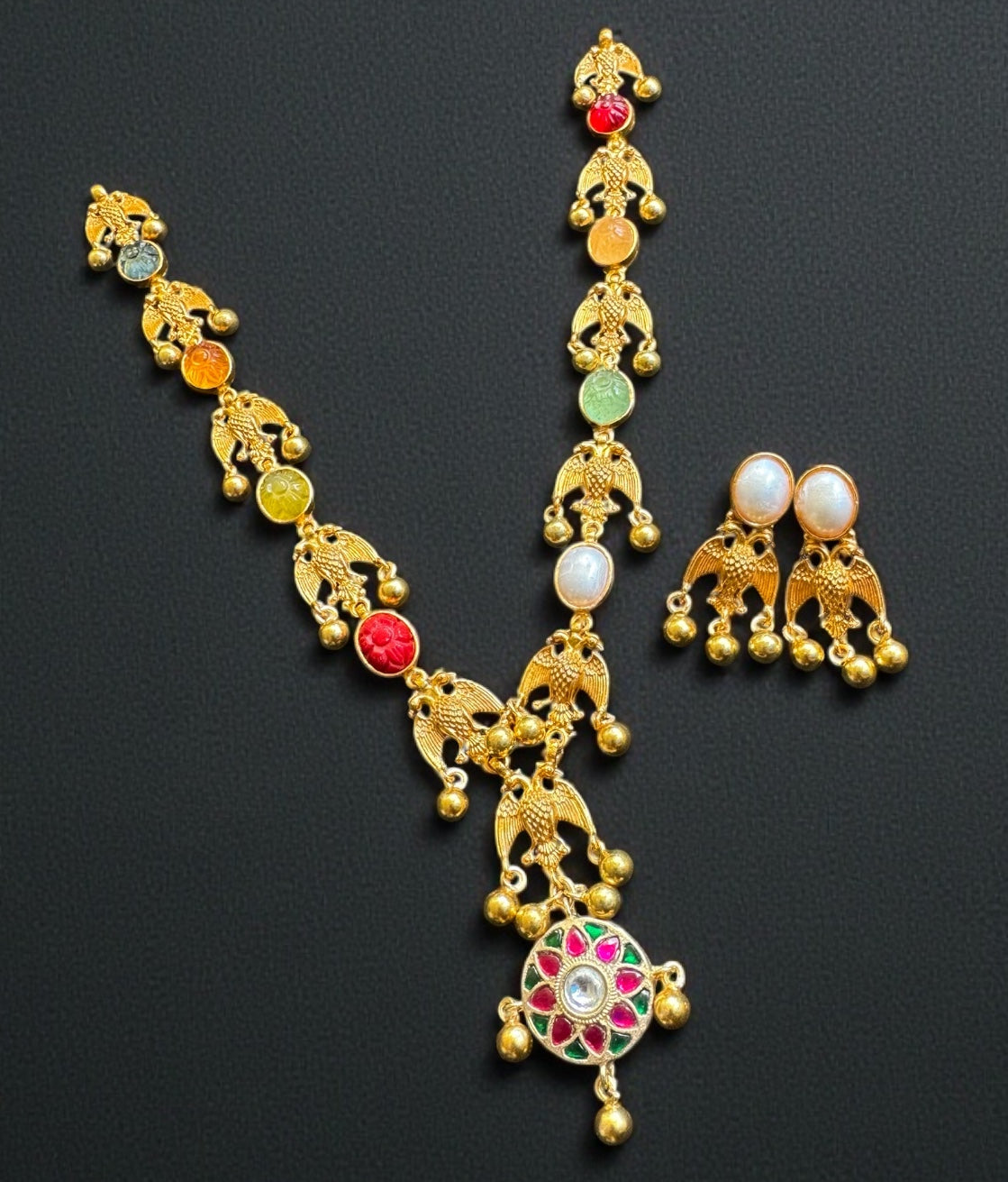 Every detail is brought to life using age-old temple jewellery techniques. The motif is framed with lustrous natural pearls and deep red Kemp stones, each set meticulously by hand to create a timeless palette of gold, white, and ruby hues. The necklace carries the unmistakable weight, finish, and authenticity of traditional temple craftsmanship.