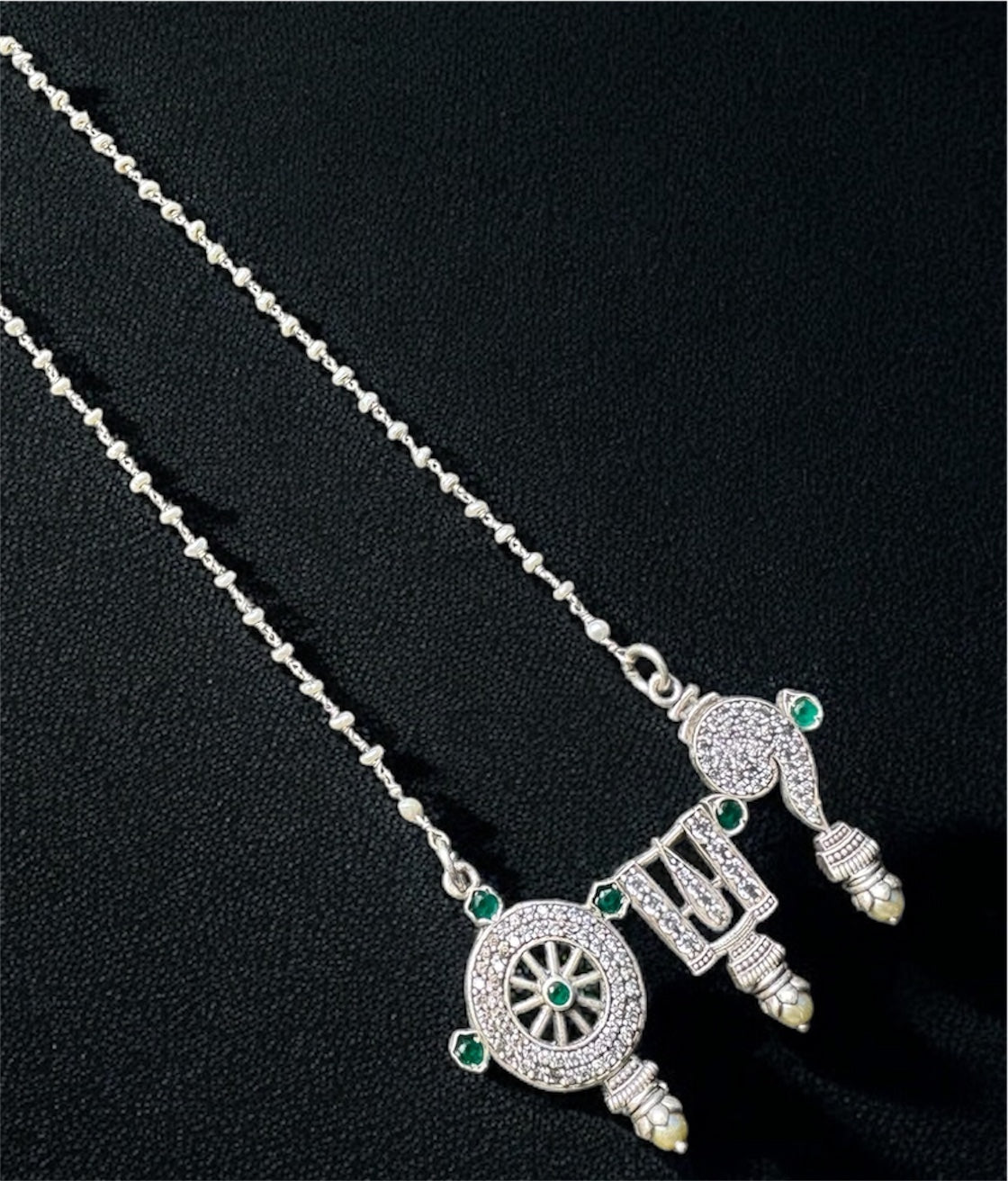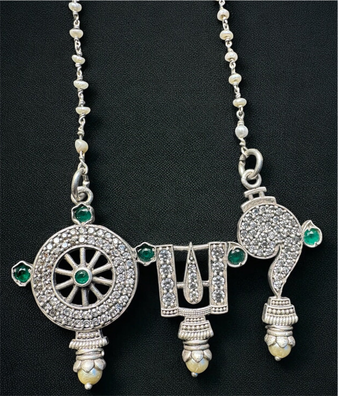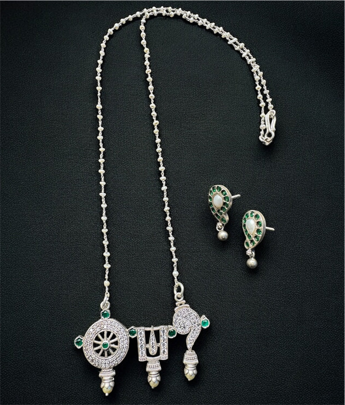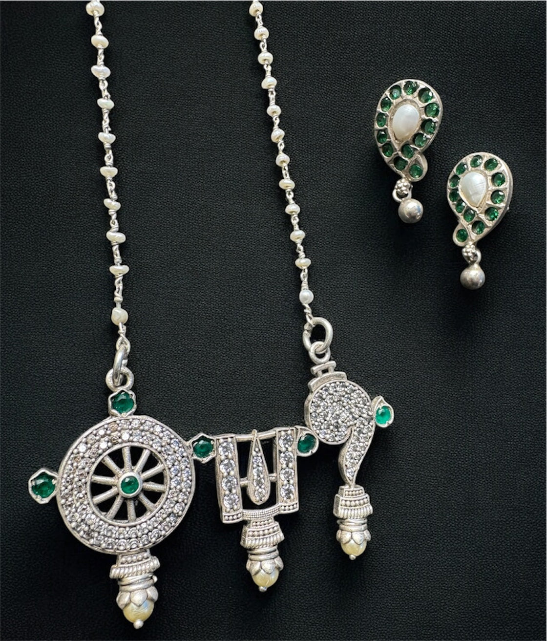 The Vajra Shankhu, Chakra Nama Silver Pearl Necklace & Earrings (Oxidised)