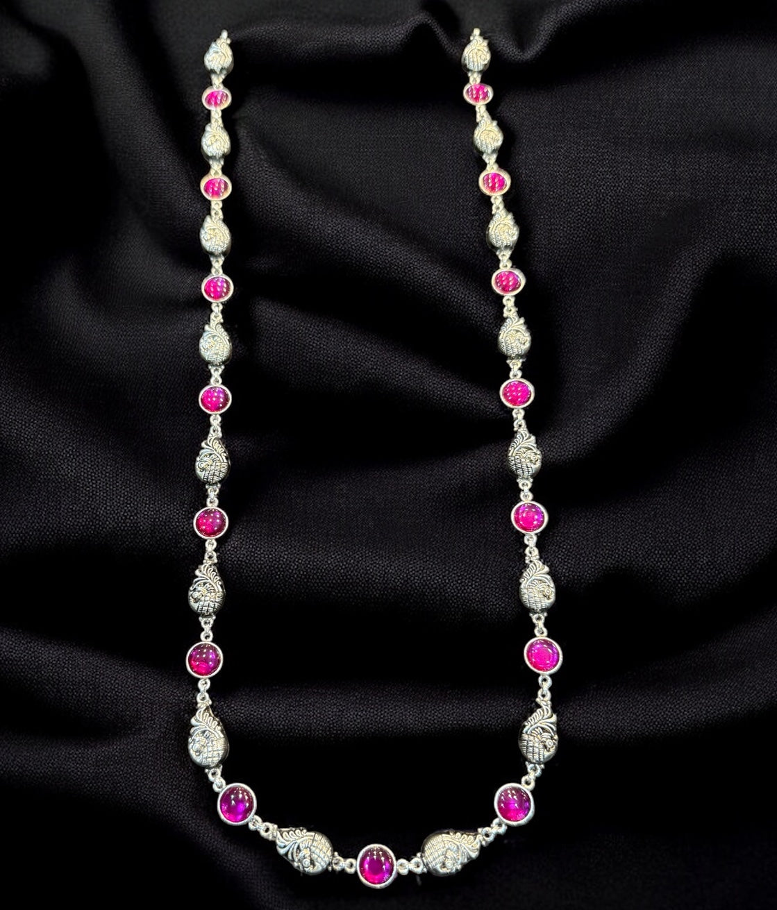 Crafted by hand entirely in pure 92.5 sterling silver this necklace offers the rich, authentic appearance of antique jewellery — without compromising on purity or craftsmanship. The nakkasi work is lifelike and meticulously detailed — a testament to centuries-old artistry passed down through generations.