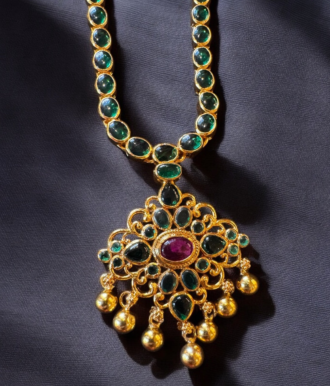 Crafted using techhniques used in ancient South Indian antique gold temple jewellery the entire piece is crafted in pure Sterling silver(92.5%) and lavishly dipped in 24K gold, the necklace boasts a rich antique finish that enhances its timeless appeal.