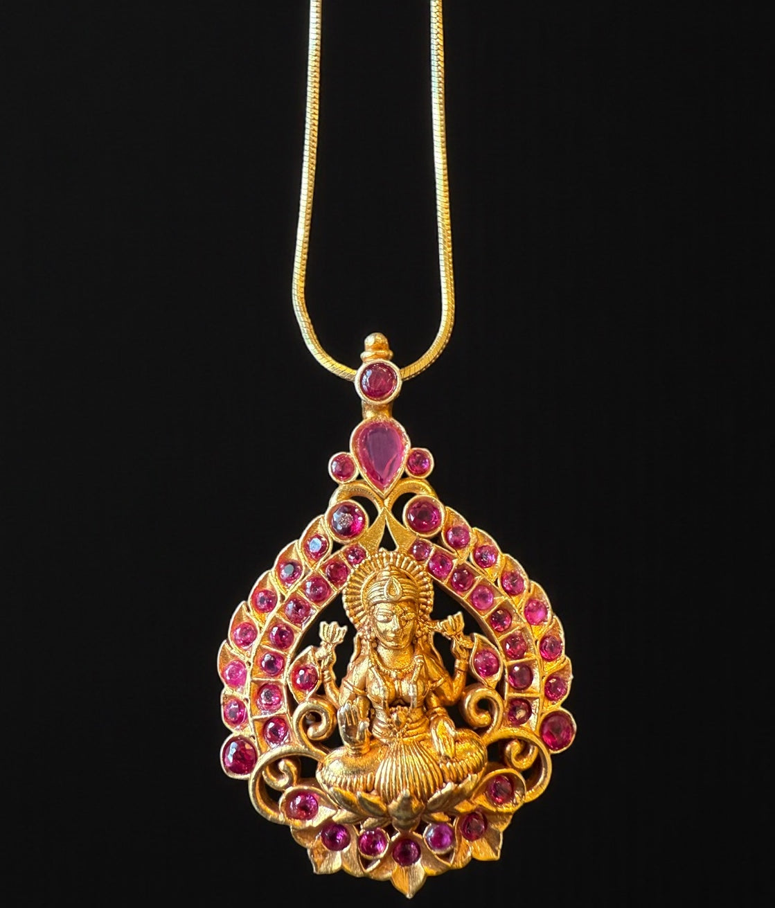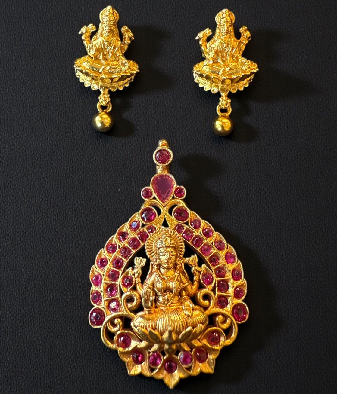 At the centre of the pendant sits a beautifully carved Lakshmi motif, symbolising prosperity and divine grace. The matching earrings also feature the same Lakshmi form, completing the look with perfect symmetry. Each piece is adorned with traditional Kemp stones, celebrated for their regal colours, luminous shine, and deep connection to South Indian heritage. Every stone is individually hand-set to achieve unmatched clarity, precision, and authenticity.