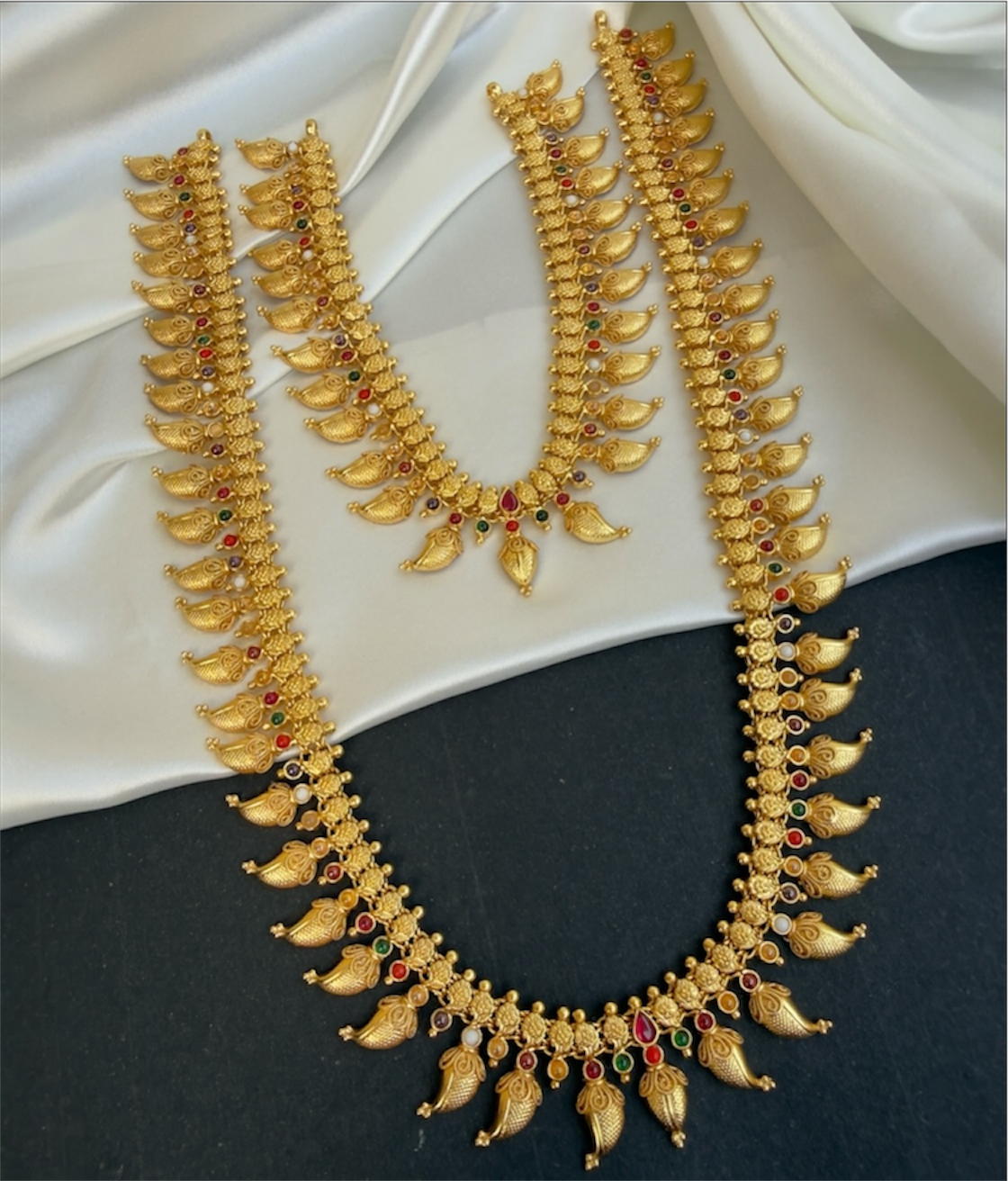 The Kasu mala is an iconic design, that is a favourite for all south indian brides. And wearing two neckalaces of the same design, one which is shorter and the other that is longer is also a tradition. So here you can buy a set of these one long and one short.