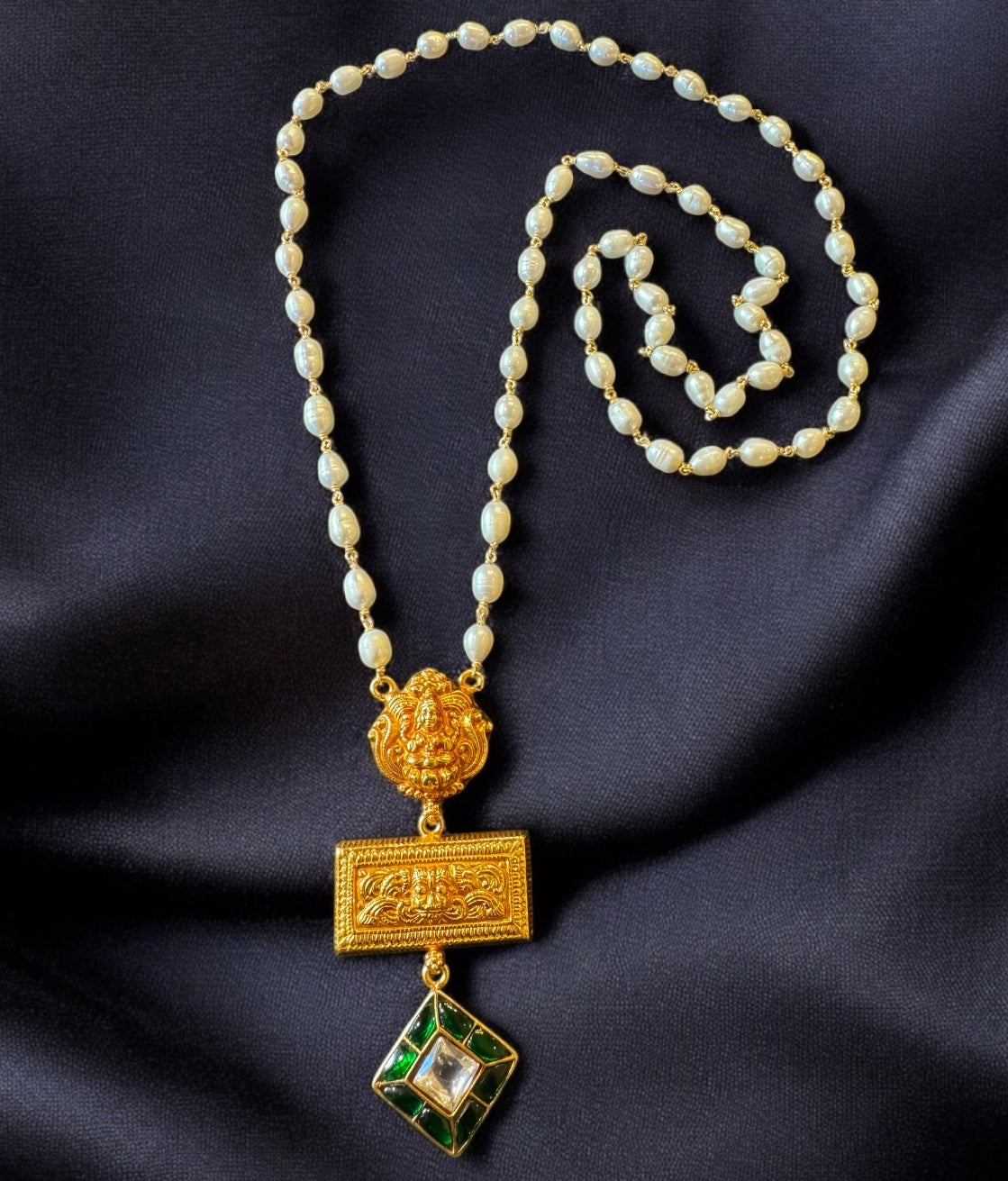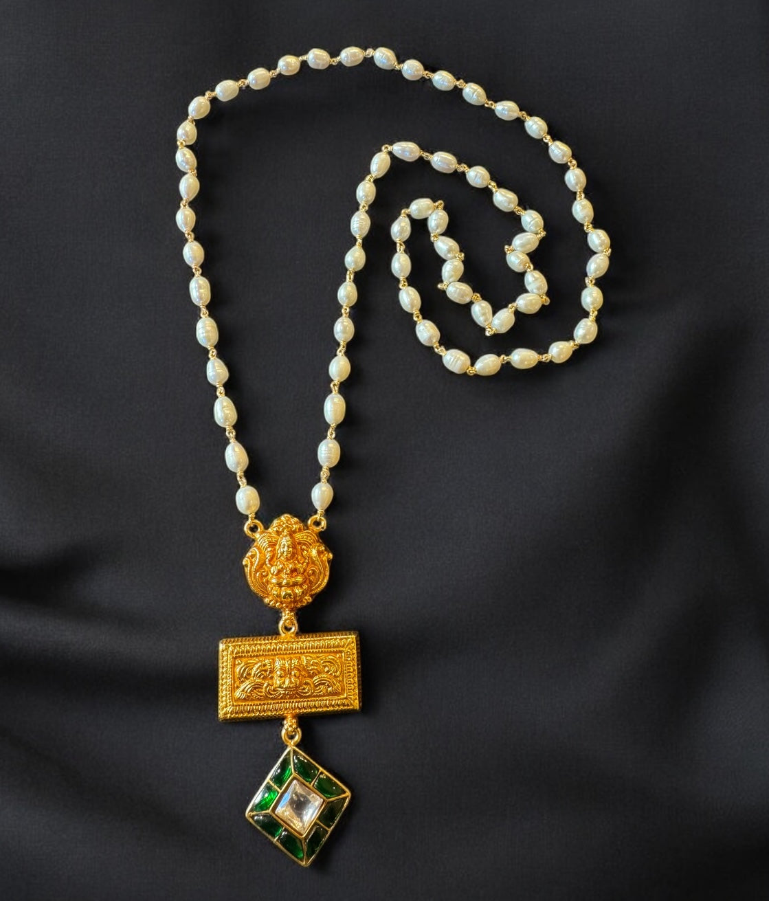 Suspended from a hand-strung chain of premium cultured freshwater pearls and silver wire, the necklace exudes antique charm with a contemporary sensibility. The necklace is gold dipped in 24 k gold to give an antique real gold look, echoing the grandeur of ancient South Indian gold temple jewellery while remaining a modern wearable heirloom.